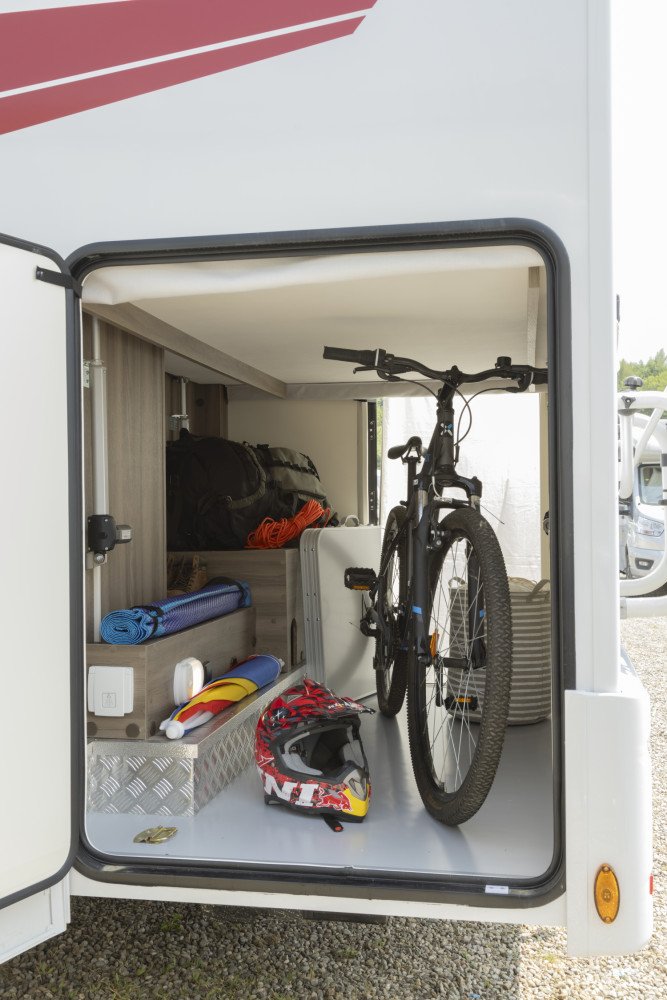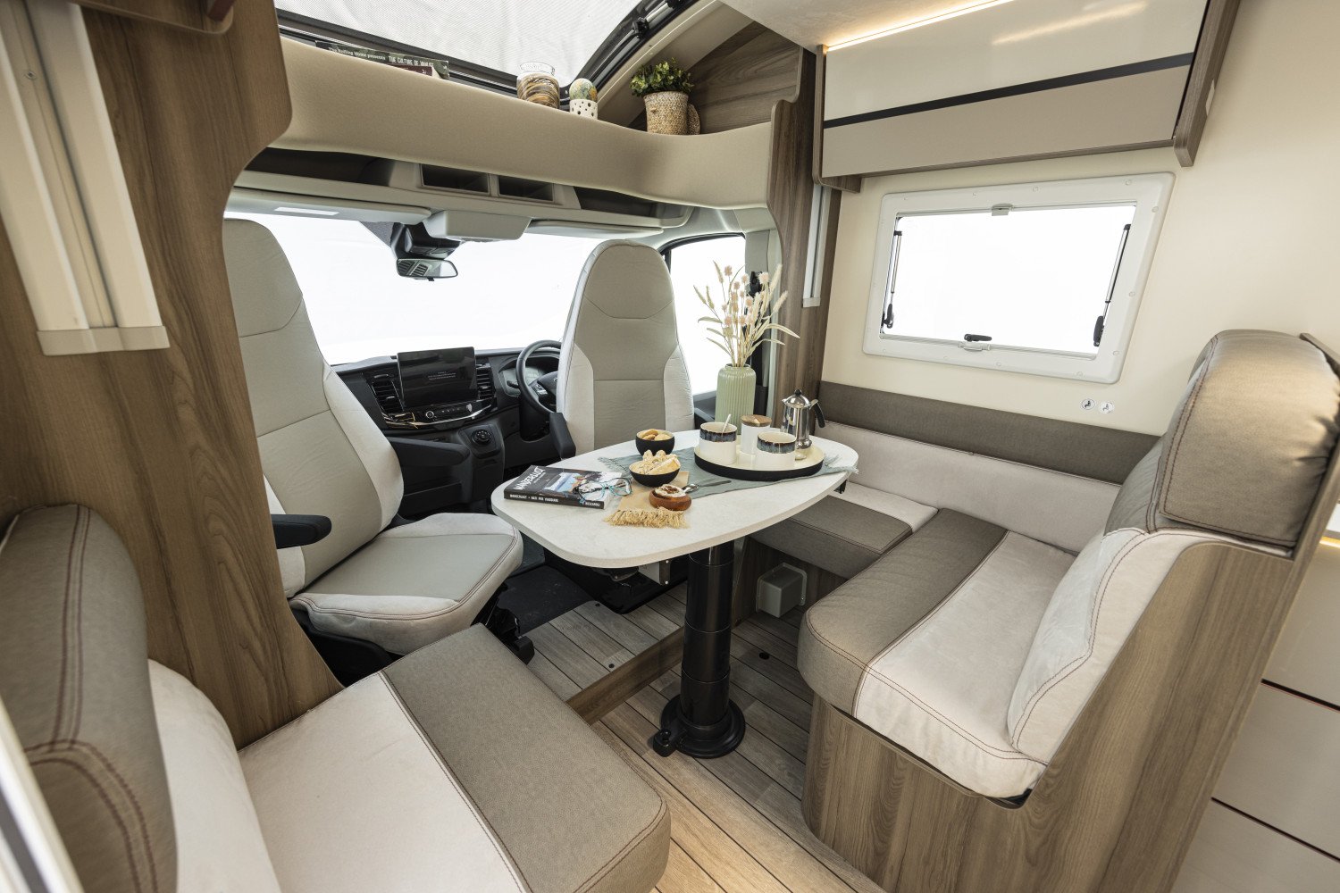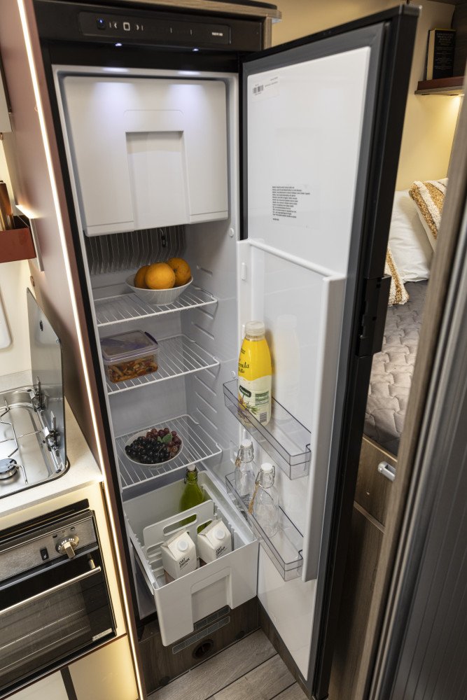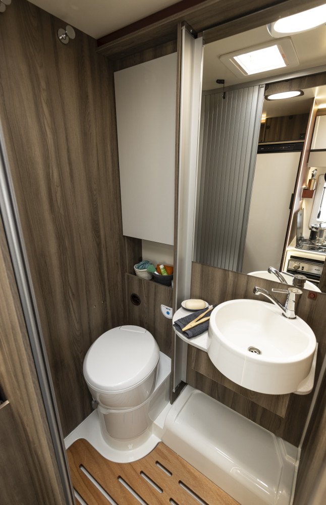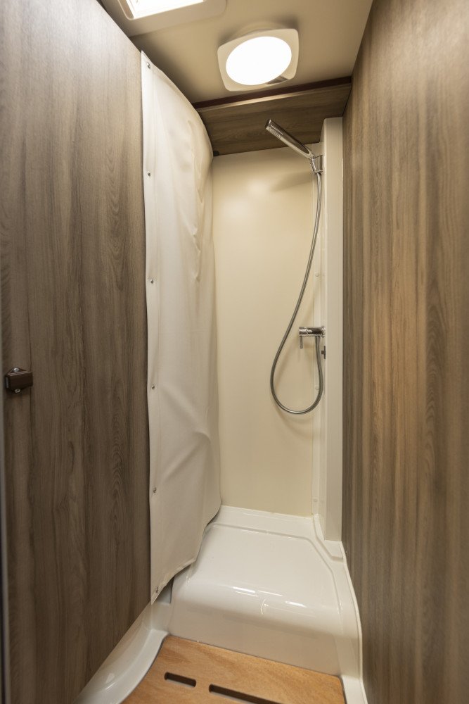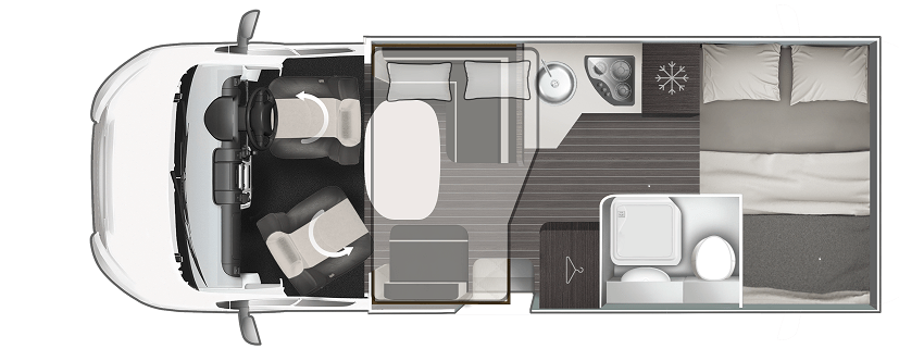 New model for 2026! Only 6.4m long yet generous, flexible living space and 2 fixed double beds. With our slim fit planet range you really can reach more places. This space-efficient layout includes a full shower and WC, practical side kitchen with hob, oven, grill and 3 way powered fridge. The rotating captain’s chairs creates a large front lounge / dining area. The rear has a fixed raised double bed over a large full width sttorage garage area. There is a second double electric drop down bed over the lounge dining area allowing up to 4 adults to sleep comfortable and leave both double beds made up day.