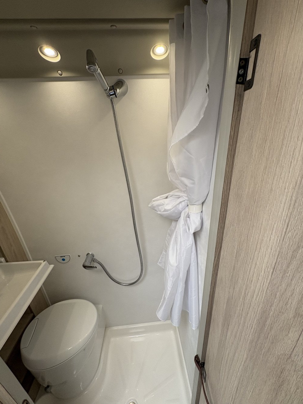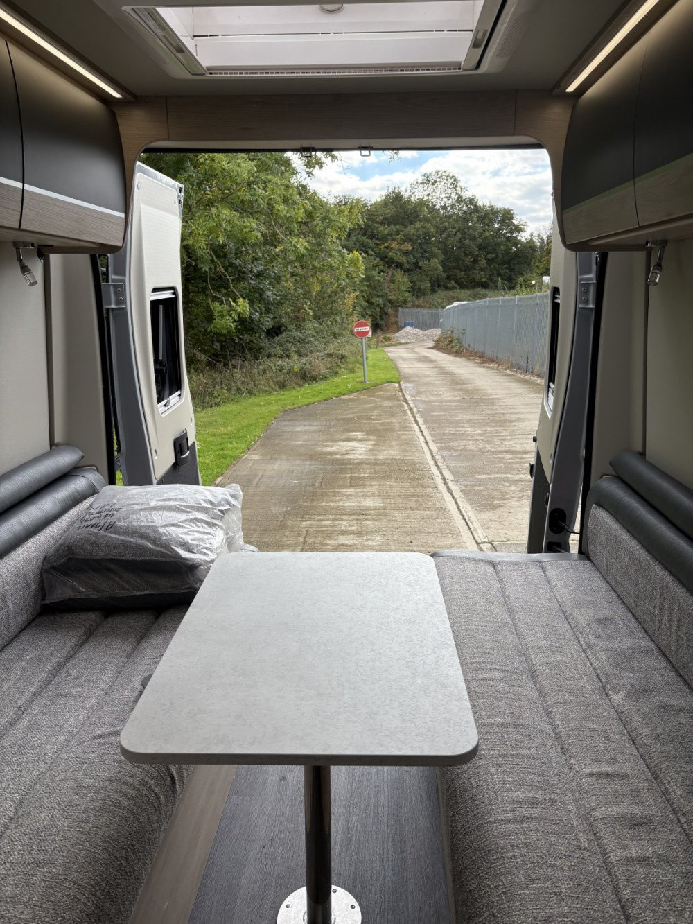 In the centre there is a full wash room with toilet, shower and drop down sink. Opposite, the side kitchen includes a two ring hob, oven, grill and sink. The Whale heating and hot water system is powered by either electric or gas and there is a 3-way automatic powered fridge freezer (240v/12v/Gas), perfect for off-grid camping. This layout has ample storage in the overhead lockers and under the seating area.