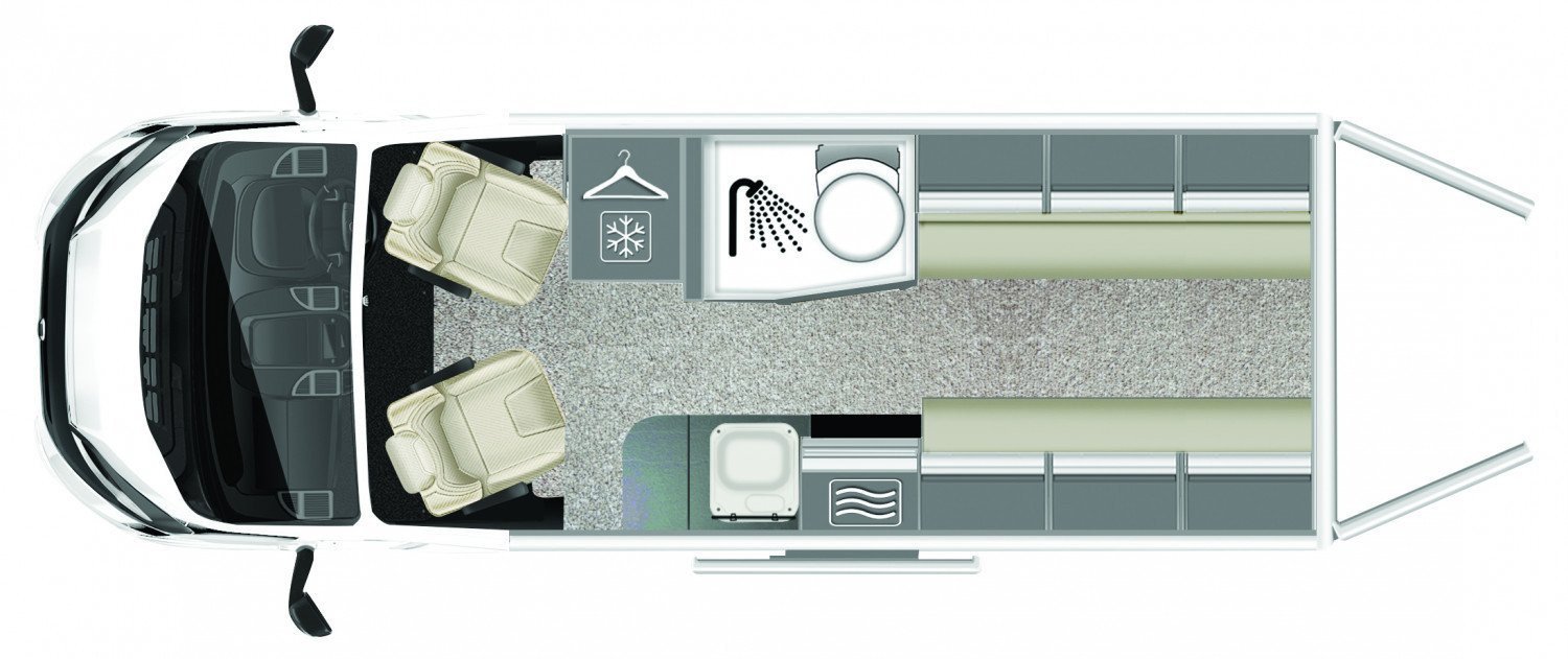 A compact 4 belt 4 berth campervan with full facilities and the optional factory fitted pop top roof bed. Rotating captain swivel seats at the front provide a seated dining area. There are bench seats at the back and a table to provide a second seating area or this can also be made up to provide a second fixed double bed.