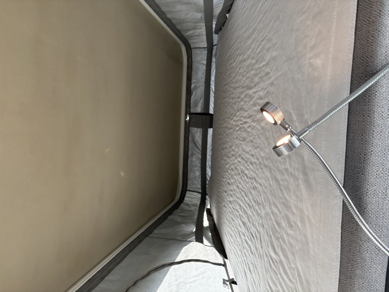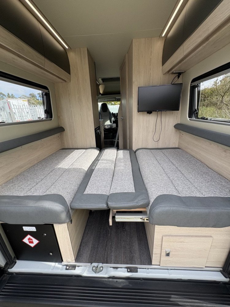 In the centre there is a full wash room with toilet, shower and drop down sink. Opposite, the side kitchen includes a two ring hob, oven, grill and sink. The Whale heating and hot water system is powered by either electric or gas and there is a 3-way automatic powered fridge freezer (240v/12v/Gas), perfect for off-grid camping. There is storage in the overhead lockers and under the seating areas.