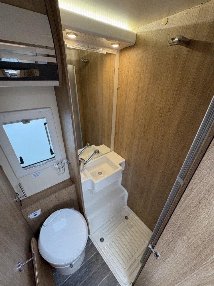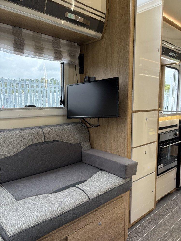 March 2024 (24) manual, 5 berth with 5 belted travel seats, spacious rear U shaped lounge which is ideal for relaxing all year round. Lounge easily converts into a king size bed. Above the dinette is an electric drop down fixed double bed which can be left made up and raised to the roof during the day. To the centre there is a well equipped modern kitchen, toilet, and washroom with shower cubicle. The vehicle is completed with a double dinette to the front with a further 3 belted travelling seats. This area can transform in the evenings into a bed allowing up to 5 adults to travel and sleep in comfort. A true UK layout offering bright spacious versatile surroundings, comfort, practicality and lots of storage including a large rear garage. Less than 3.5t, drive on standard UK licence.